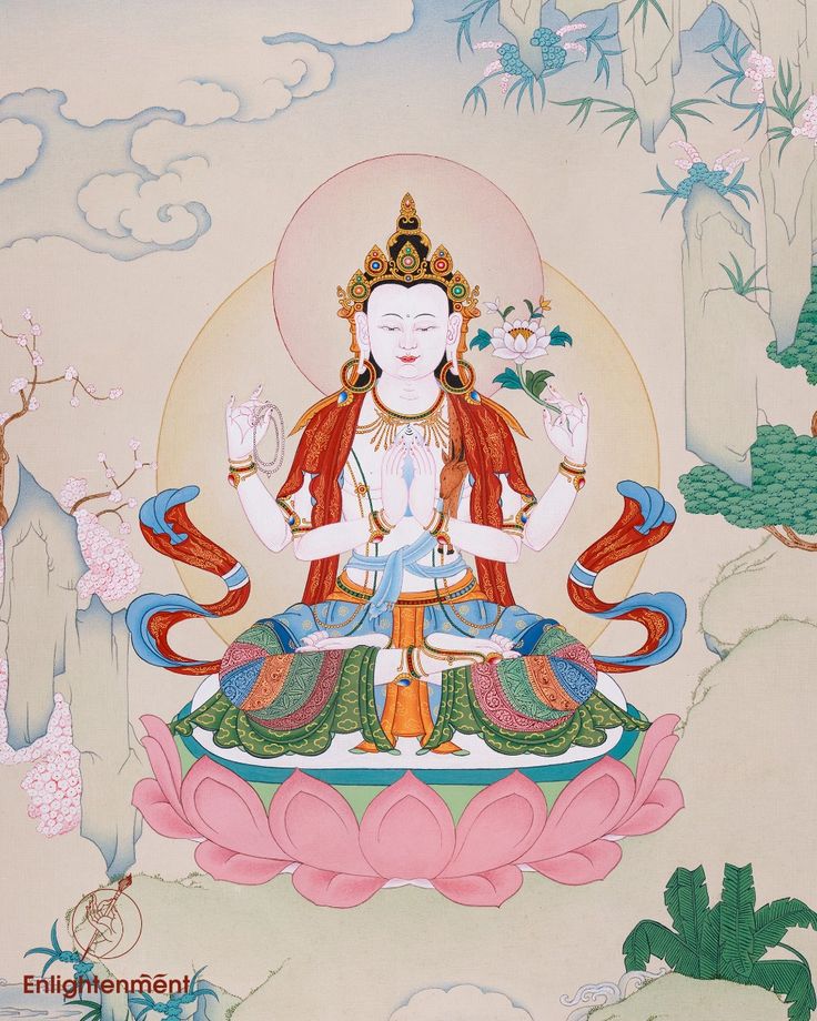 Tôn ảnh: Đức Bồ Tát Quan Âm Tứ Thủ (Quán Tự Tại Bồ Tát) Sắc được tạo ra bởi cái thấy và biết, chính là Tâm (có 4 Tâm Vương – Tham, Sân, Si, Siêu thế và 121 Tâm Sở). Khi hành trì, việc Thiền quán tưởng, hành đến đâu…